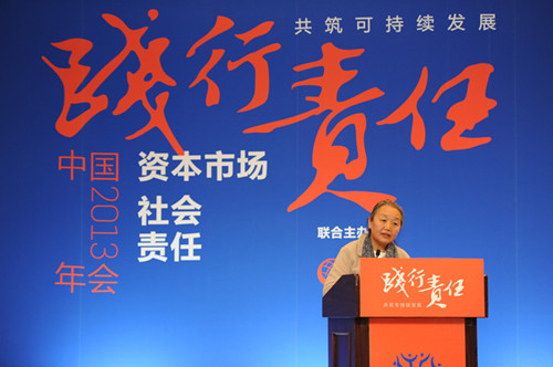 圖為公司董事長(zhǎng)雷菊芳女士在中國(guó)資本市場(chǎng)2013社會(huì)責(zé)任年會(huì)上做主題發(fā)言。