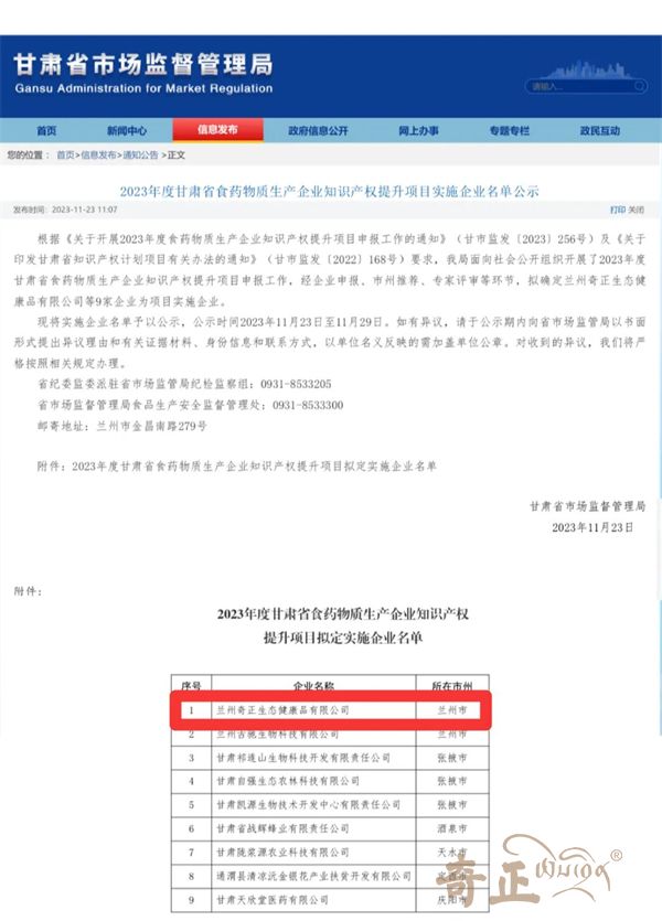 近日,甘肅省市場監(jiān)督管理局公布了2023年度甘肅省食藥物質(zhì)生產(chǎn)企業(yè)知識產(chǎn)權(quán)提升項目的實施企業(yè)名單,蘭州奇正生態(tài)健康品有限公司(以下簡稱“奇正健康”)憑借自身知識產(chǎn)權(quán)實力和項目實施能力,被確定為甘肅省食藥物質(zhì)生產(chǎn)企業(yè)知識產(chǎn)權(quán)提升項目的實施企業(yè)。全省僅有9家企業(yè)進入實施企業(yè)名單,目前已完成公示。
